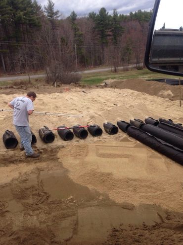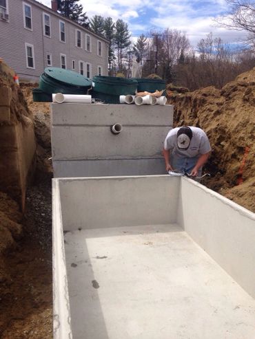 We install all types of septic systems, below is an example of an Advanced Enviro Septic we installed in Chesterfield for a large apartment house and the final photo is spreading seed and mulch on another finished system in Harrisville.